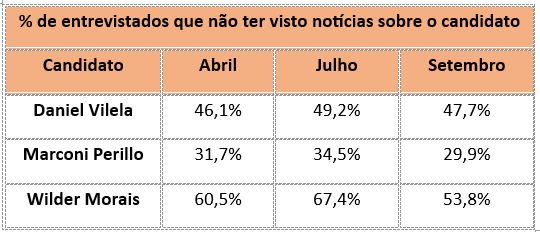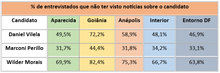 O melhor desempenho no período foi de Wilder Morais, que conseguiu reduzir em quase 14 pontos percentuais o número de eleitores que afirmam não ter visto notícias sobre ele — um avanço respeitável, ainda que partindo de um patamar modesto de visibilidade.
