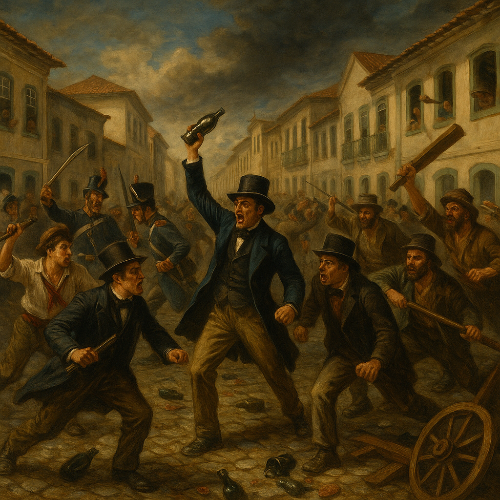 Para os brasileiros opositores — o “partido brasileiro” —, a festa soou como uma provocação direta, especialmente após a hostilidade demonstrada em Minas Gerais. Embora o imperador tenha retornado no dia 11, foi na madrugada de 13 de março que os dois grupos se encontraram nas ruas. O que começou com provocações verbais rapidamente escalou para a violência física.
