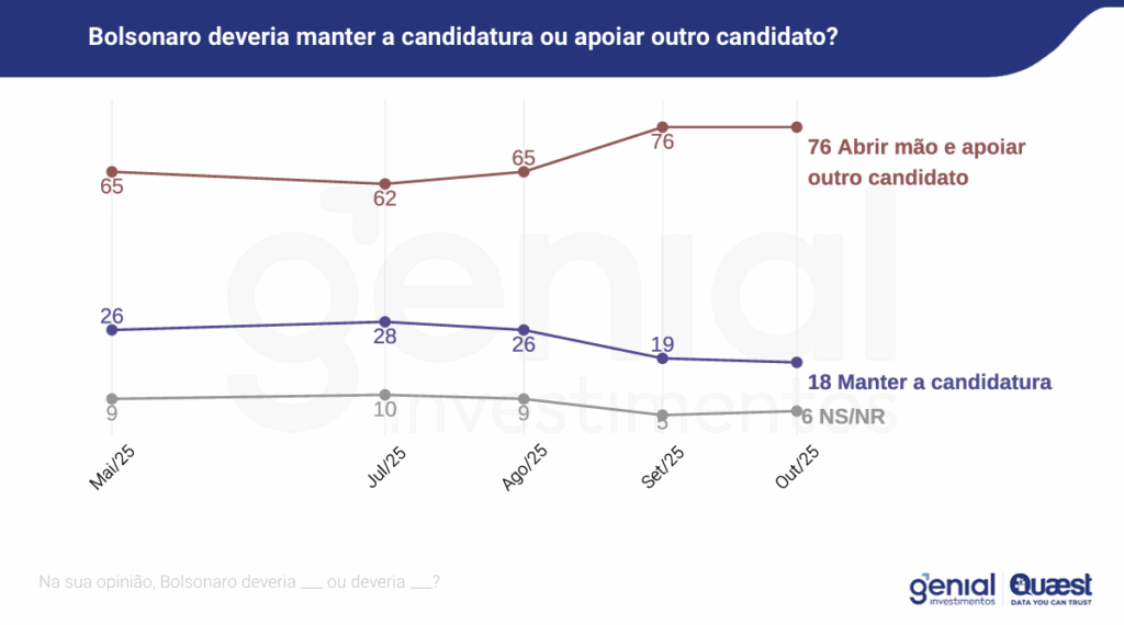 Apesar da liderança consolidada, a pesquisa indica que 56% dos eleitores acreditam que Lula não deveria disputar reeleição, enquanto 42% defendem uma nova candidatura. No caso de Bolsonaro, 76% consideram que ele deveria apoiar outro candidato, repetindo o índice observado em setembro.