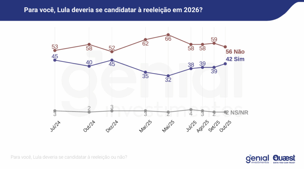 O levantamento foi realizado entre 2 e 5 de outubro de 2025, com 2.004 entrevistas presenciais em todo o país. A margem de erro é de 2 pontos percentuais, e o nível de confiança é de 95%.