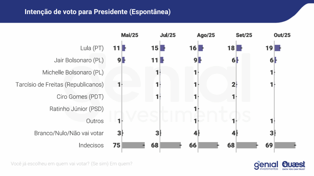 A pesquisa espontânea, na qual os entrevistados citam candidatos sem estímulo, mostra crescimento de Lula: de 11% em maio para 19% em outubro. Bolsonaro, por outro lado, caiu de 11% para 6% no mesmo período. O percentual de eleitores indecisos permanece em 69%.