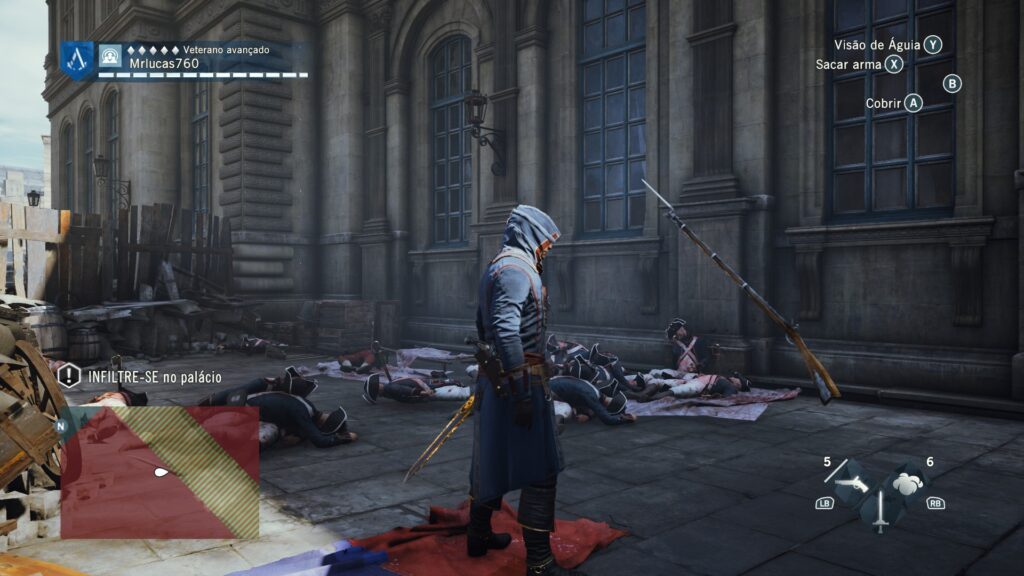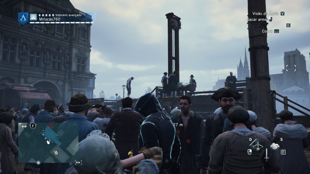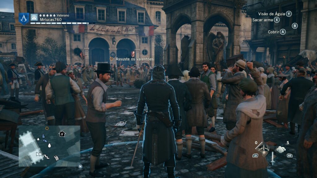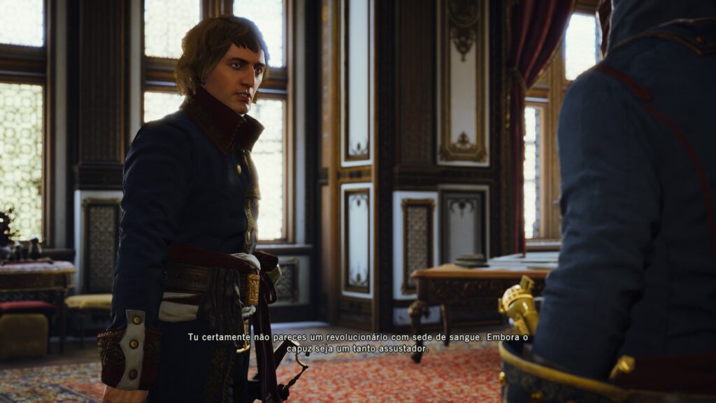 O jogo ainda nos brinda com figuras históricas como Napoleão Bonaparte e Robespierre. E, entre as missões, destaco um assassinato específico: a oportunidade de se infiltrar na fila da guilhotina, disfarçado entre os condenados, para se aproximar do alvo. É um design de missão muito interessante. Infelizmente, o vilão principal da trama é o oposto: tão discreto que se torna completamente esquecível.