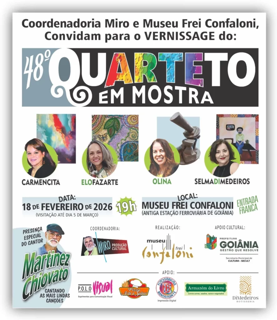 Além dos eventos específicos do final de semana, o público pode visitar a 48ª edição do “Quarteto em Mostra” no Museu Frei Confaloni (Antiga Estação Ferroviária). A exposição apresenta obras das artistas Carmencita, Elofazarte, Olina e Selma Di Medeiros, abrangendo pintura e escultura. A visitação é gratuita e segue até o dia 5 de março.