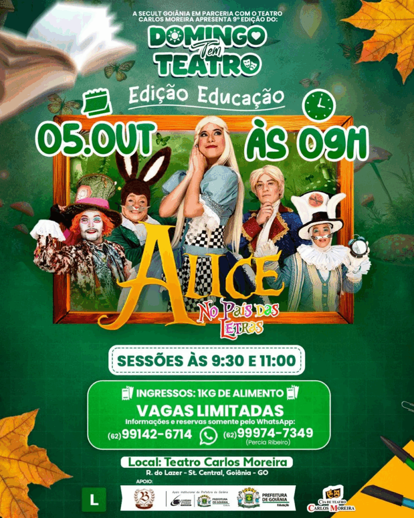 O projeto Domingo Tem Teatro apresenta “Alice no País das Letras”, na Rua do Lazer, com sessões às 9h30 e 11h. A entrada é solidária mediante a doação de 1 kg de alimento não perecível. O espetáculo infantil propõe uma releitura lúdica do clássico de Lewis Carroll, abordando incentivo à leitura, convivência entre gerações e uso equilibrado da tecnologia. Além da peça, haverá oficinas, exposições, contação de histórias, pintura facial e a Feira do Empreendedor Mirim.