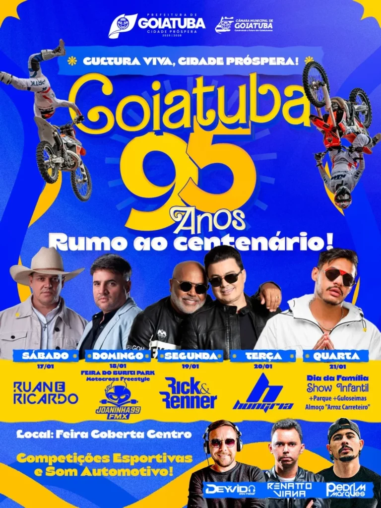 Aniversário de 95 anos de Goiatuba – A cidade vizinha inicia suas festividades na Feira Coberta. No sábado, a atração principal é o show de Ruan & Ricardo. Fundada em 1931 sob o nome de Bananeiras, Goiatuba celebra sua história agrícola e seus espaços de lazer, como o Parque dos Buritys.