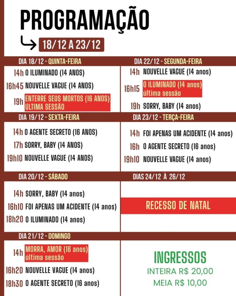 O Cine Cultura mantém programação especial de fim de semana até domingo, no Centro Cultural Marietta Telles Machado, na Praça Cívica. As sessões ocorrem ao longo do dia, com ingressos a R$ 20 (inteira) e R$ 10 (meia), e não haverá exibições entre os dias 24 e 26 de dezembro.