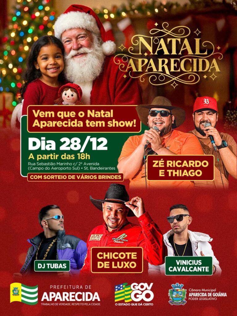O Natal Aparecida realiza neste domingo (28) mais uma ação descentralizada da programação natalina em Aparecida de Goiânia. A partir das 18h, moradores da região do Aeroporto Sul poderão acompanhar uma série de shows musicais gratuitos, além de atividades voltadas ao público infantil e sorteio de brindes. O evento acontece na Rua Sebastião Marinho, esquina com a 2ª Avenida, no Setor Bandeirantes, em uma área próxima ao campo de futebol do bairro.