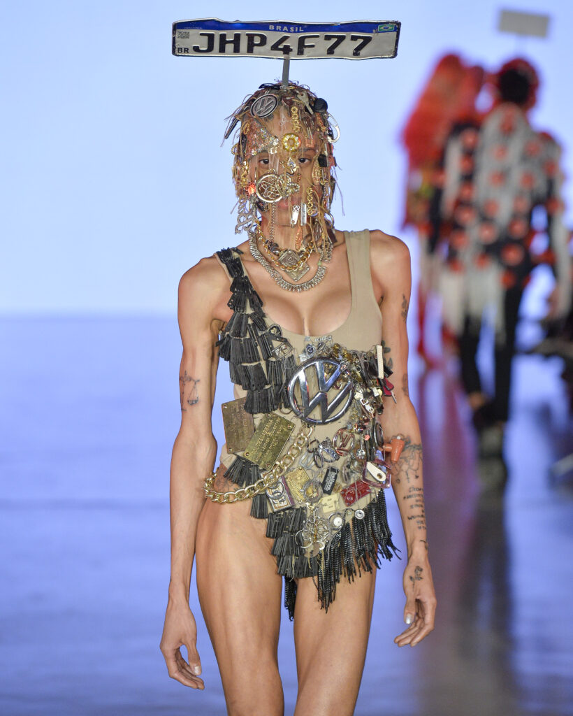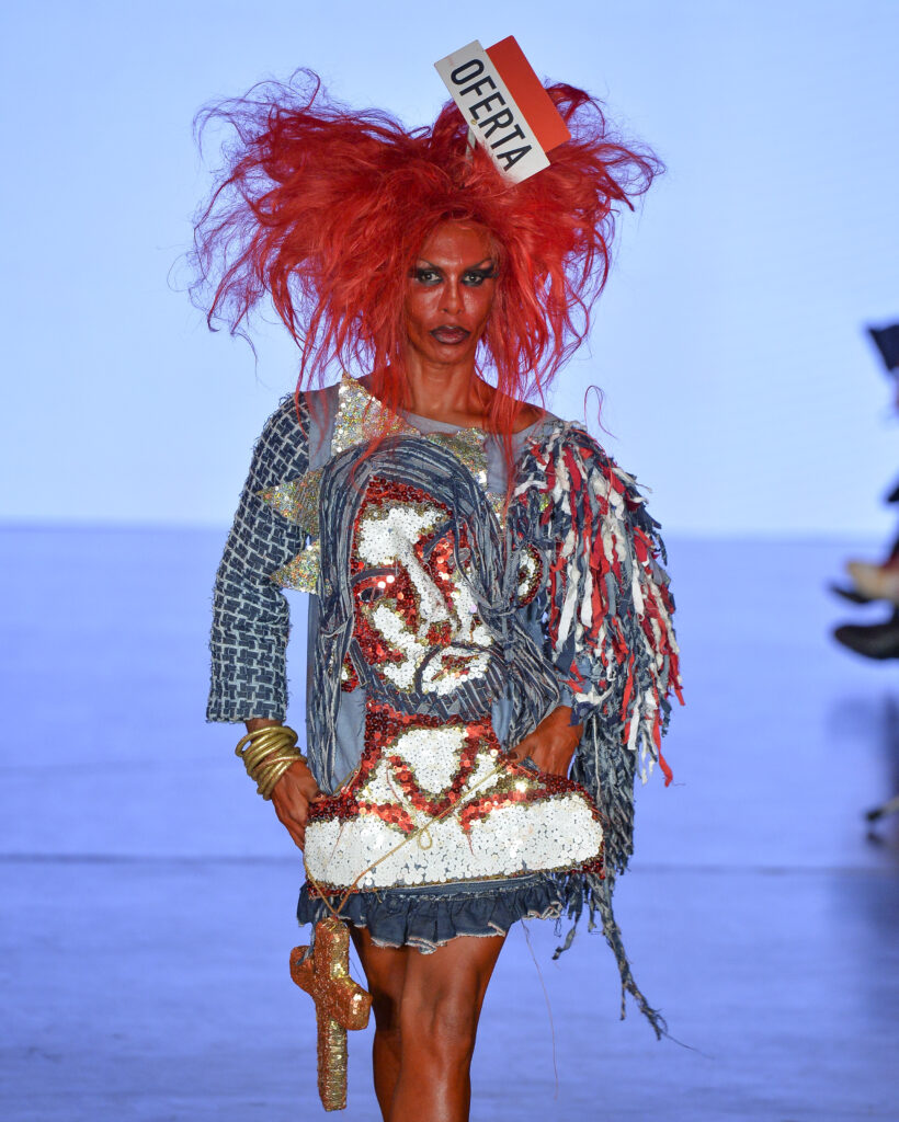 A abertura do desfile não deixou dúvidas sobre a provocação. Ao som de “Do jeito que o diabo gosta”, cantada pela artista drag Ottair, a primeira modelo cruzou a passarela com o rosto pintado e um símbolo de oferta na cabeça.