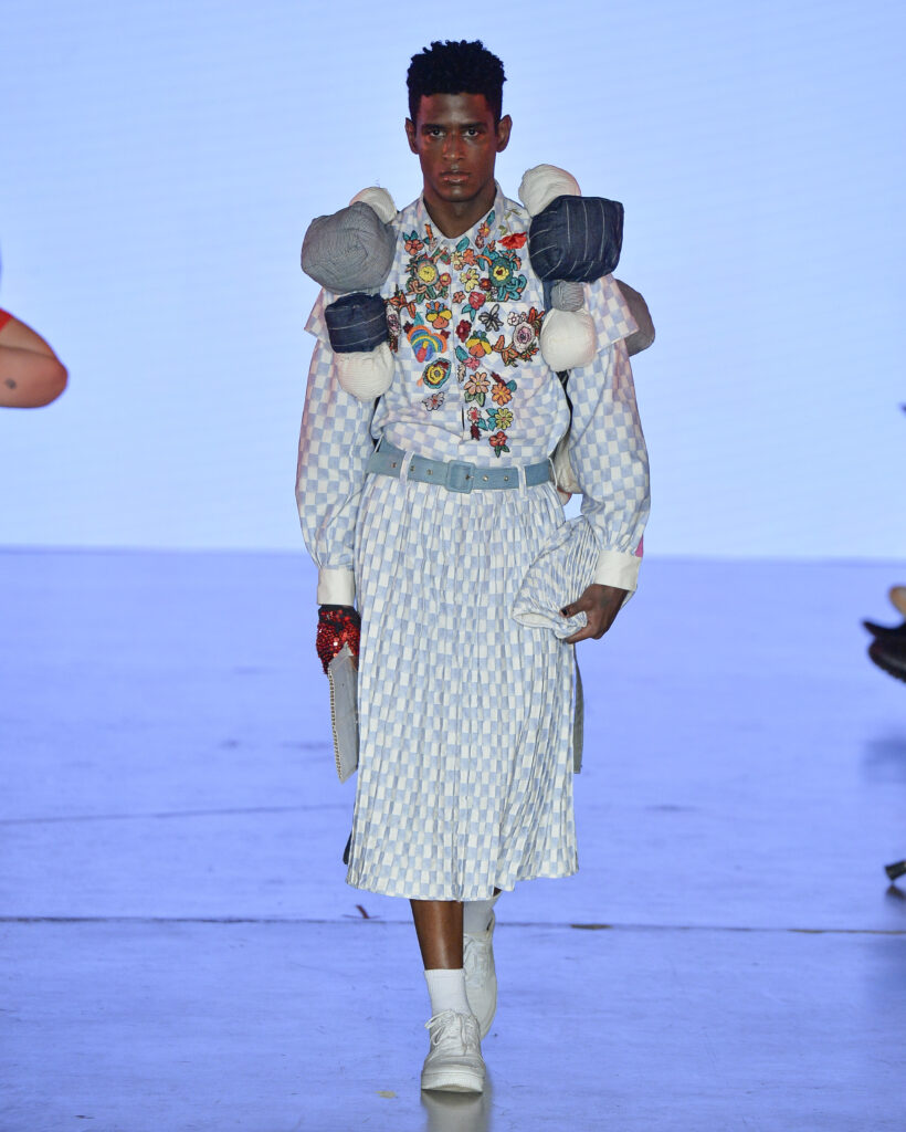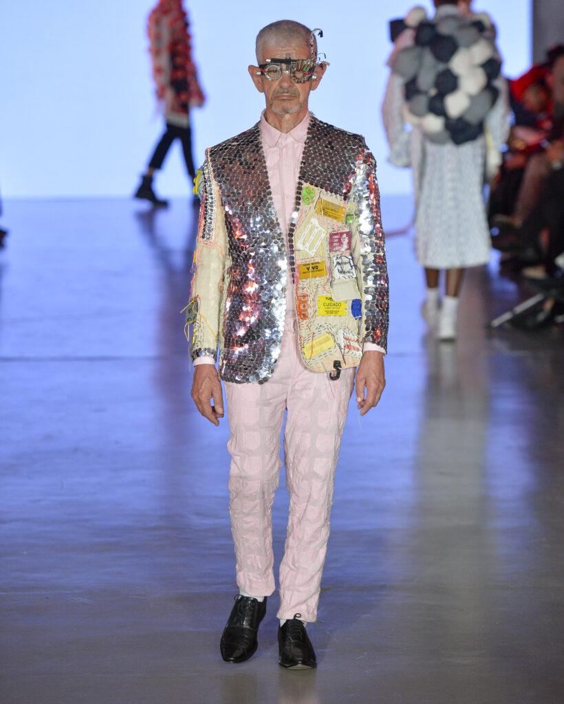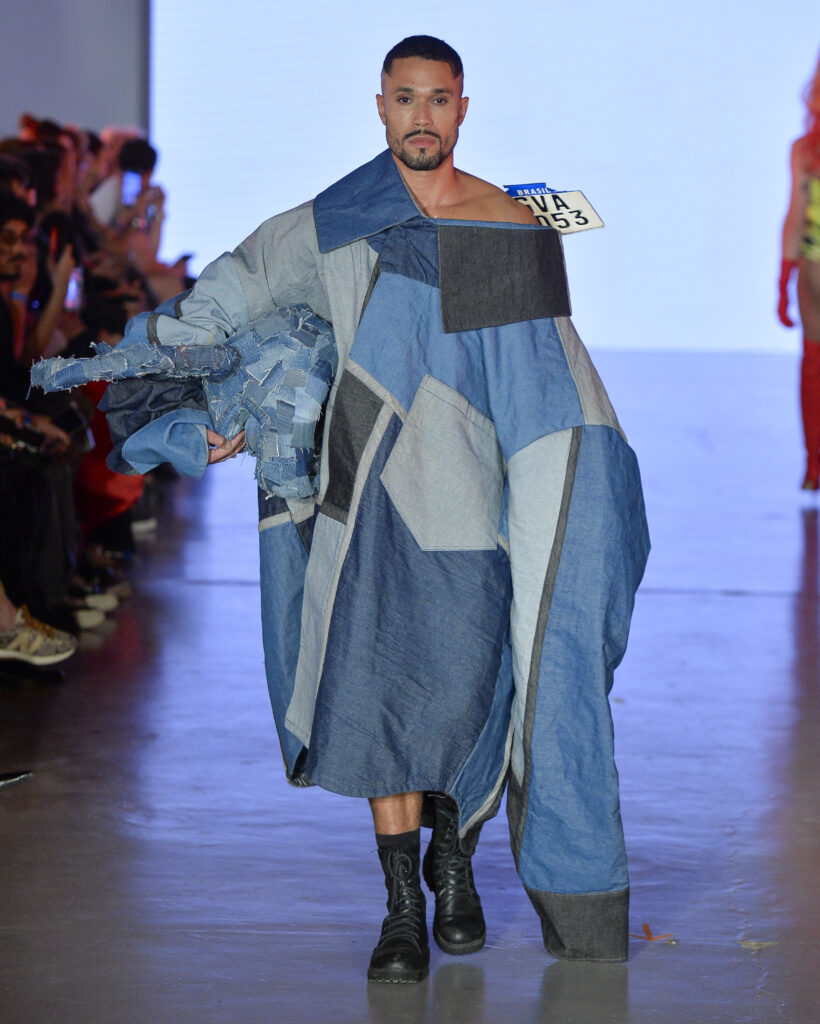 Além do material inusitado, a coleção mescla o algodão (sua raiz no concurso estudantil) com tafetá e sintéticos, criando uma superposição que ele chama de “experiência cotidiana”.