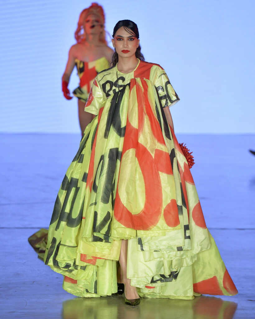 “Eu desci, enchi sacos com aquilo e levei para casa,” conta. O material, que para a maioria é apenas poluição visual urbana, foi transformado. Lucas aplicou plásticos, criou texturas, franzidos e até um drapeado manual complexo — peça por peça, alfinete por alfinete — para vestir Ottair. O resultado é uma moda que funde o upcycling do lixo com a alta costura.