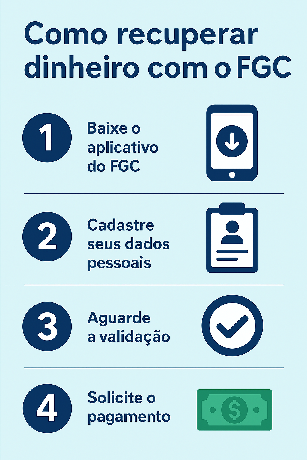 O processo se divide em três etapas: o liquidante reúne a base de credores e encaminha ao FGC; o fundo valida as informações e libera o pedido de ressarcimento, normalmente em até 48 horas; e a transferência ocorre logo após a solicitação. Pessoas físicas realizam todas as etapas pelo app, enquanto empresas devem acessar o Portal do Investidor do FGC e seguir as instruções enviadas por e-mail pelo próprio fundo.