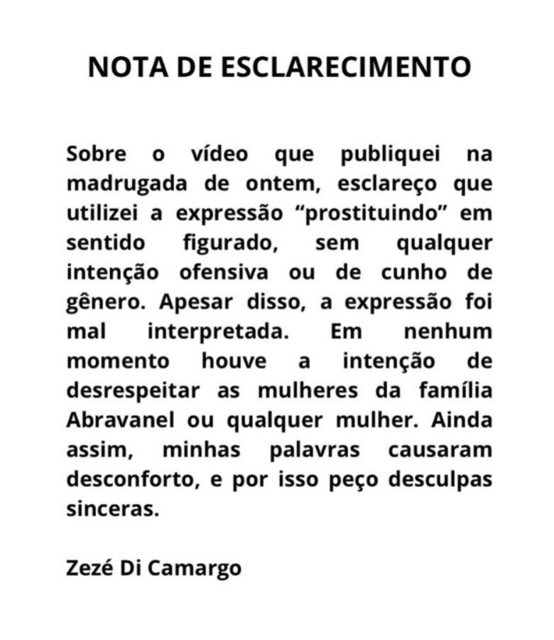 Em sua nota de retratação, o cantor alegou que não teve o objetivo de ofender as empresárias. “Utilizei a expressão em sentido figurado, sem qualquer intenção ofensiva ou de cunho de gênero”, justificou o músico. Zezé admitiu que suas palavras causaram desconforto e encerrou a nota dizendo que respeita as mulheres da família Abravanel e o público feminino em geral.