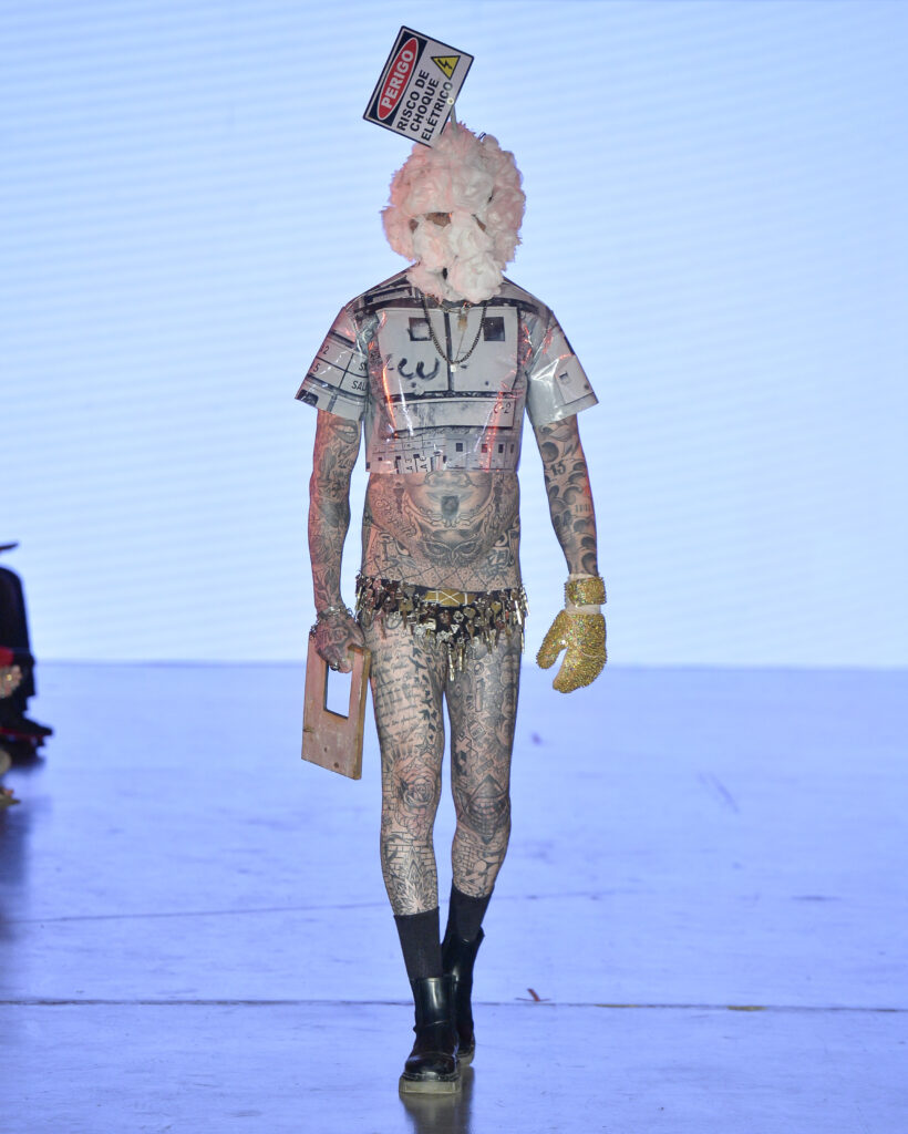 Além da cantora, outros integrantes do clipe vestem peças de Lucas Caslú. O dançarino Juliano Floss utiliza uma máscara desenvolvida a partir de coleções anteriores do designer, composta por sapatinhos de boneca. Já o corpo de baile que acompanha Marina aparece com elementos como a saia feita de tampinhas, item que se tornou uma das marcas visuais mais reconhecidas do artista.