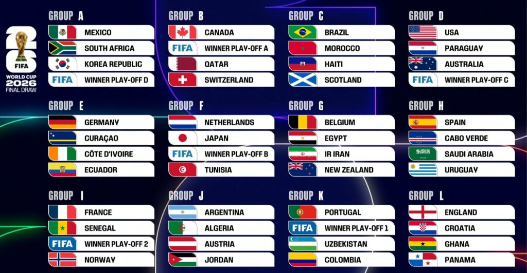 - Repescagem Intercontinental (2 vagas): A Chave 1 (RD Congo, Jamaica ou Nova Caledônia) manda o classificado para o Grupo K. Já a Chave Intercontinental 2 (Bolívia, Suriname ou Iraque) coloca o vencedor no Grupo I.