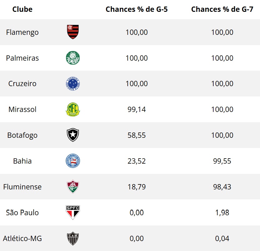 O Botafogo garantiu sua presença na Conmebol Libertadores pelo terceiro ano consecutivo (feito inédito na história do clube) ao bater o Grêmio por 3 a 2. Na briga pelas vagas restantes, Bahia e Fluminense despontam como favoritos, com 99,55% e 98,43% de chances, respectivamente. São Paulo (1,98%) e Atlético-MG (0,04%) correm por fora. O desfecho da Copa do Brasil ainda pode transformar o G-6 em G-8, o que alteraria esse cenário.