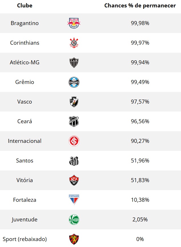 Na parte inferior da tabela, o empate em 1 a 1 entre Internacional e Santos no Beira-Rio complicou ambas as equipes, mas puniu severamente os paulistas. O Santos permaneceu na zona de rebaixamento e viu sua probabilidade de permanência cair para 51,96%. O Inter, por outro lado, mantém 90,27% de chances de ficar na elite.