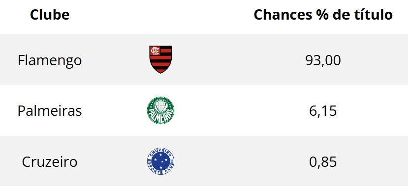 O Flamengo lidera as estatísticas com 93% de probabilidade de título, deixando o Palmeiras com 6,15% e o Cruzeiro com meros 0,85%. O Rubro-Negro carioca pode gritar “campeão” já nesta terça-feira. Para isso, precisa vencer o Atlético-MG na Arena MRV e torcer por uma derrota do Palmeiras diante do Grêmio, em Porto Alegre. Mesmo se os paulistas empatarem, uma vitória flamenguista praticamente assegura a conquista, pois o Verdão precisaria reverter uma desvantagem de 22 gols de saldo nos dois jogos restantes.