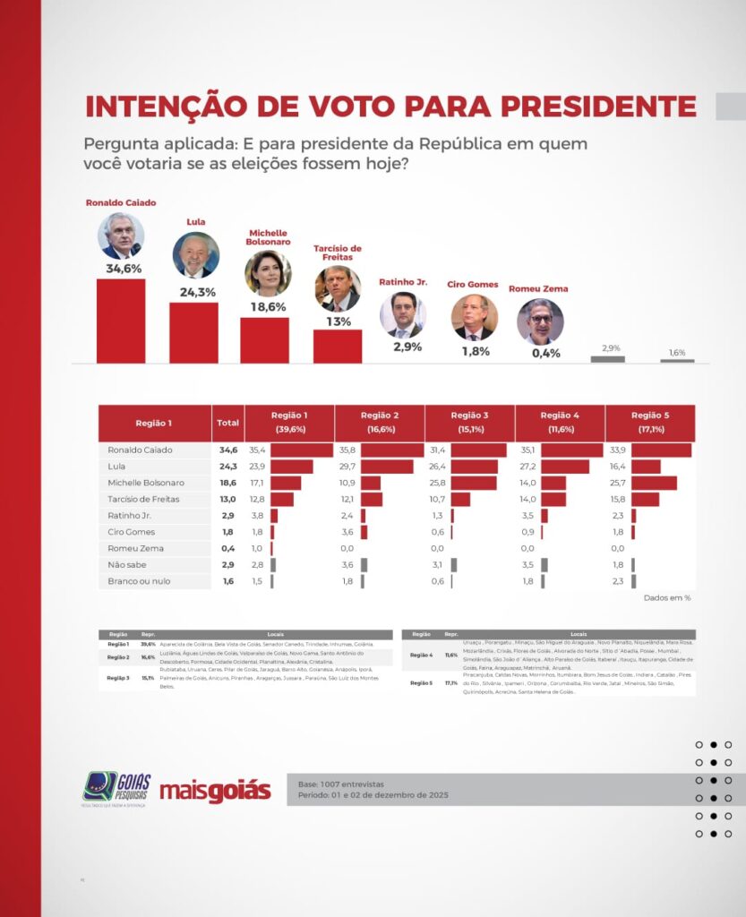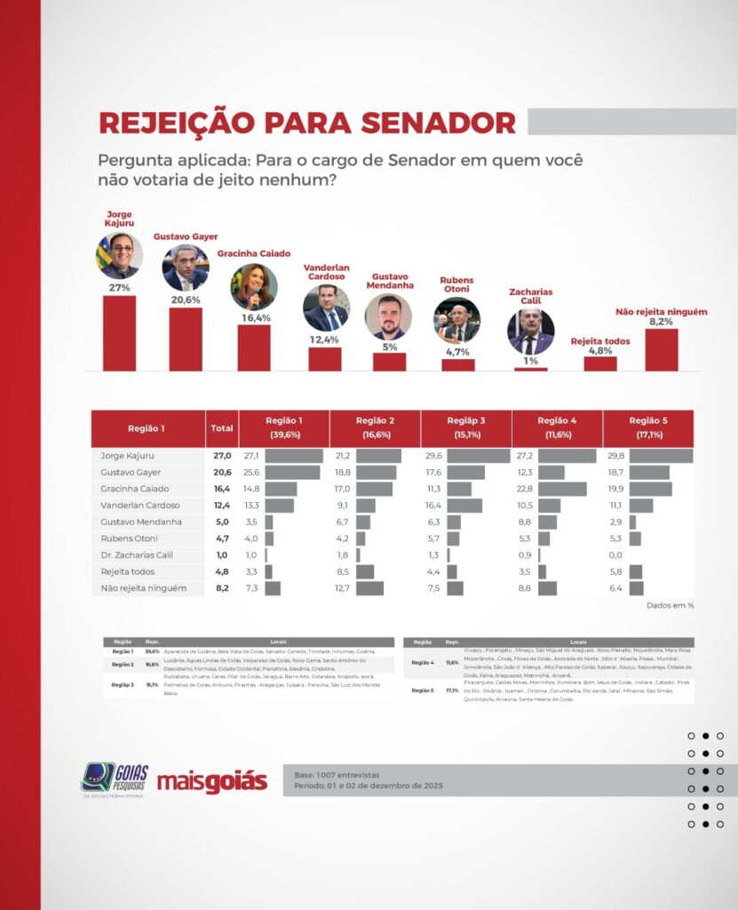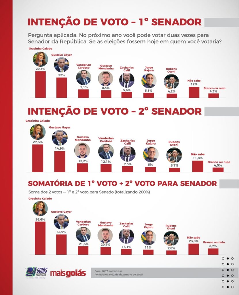 A pesquisa também avaliou a corrida ao Senado. Gracinha Caiado (União Brasil) aparece à frente, com 29,3% no primeiro voto. Em seguida, Gustavo Gayer (PL) marca 22%. Vanderlan Cardoso (PSD) tem 9,1%, Gustavo Mendanha (PSD) aparece com 8,4% e Zacharias Calil (União Brasil) soma 5,6%. O senador Jorge Kajuru (PSB) registra 5,1%, e Rubens Otoni (PT), 4,2%.