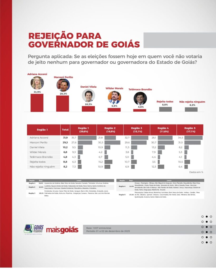 A rejeição também foi medida. Adriana lidera com 31,9%, seguida por Marconi (29,3%). Daniel registra 10,2%, e Wilder, 6,8%. Outros 8,8% disseram rejeitar todos os nomes listados, enquanto 8,2% afirmaram não rejeitar nenhum dos candidatos.