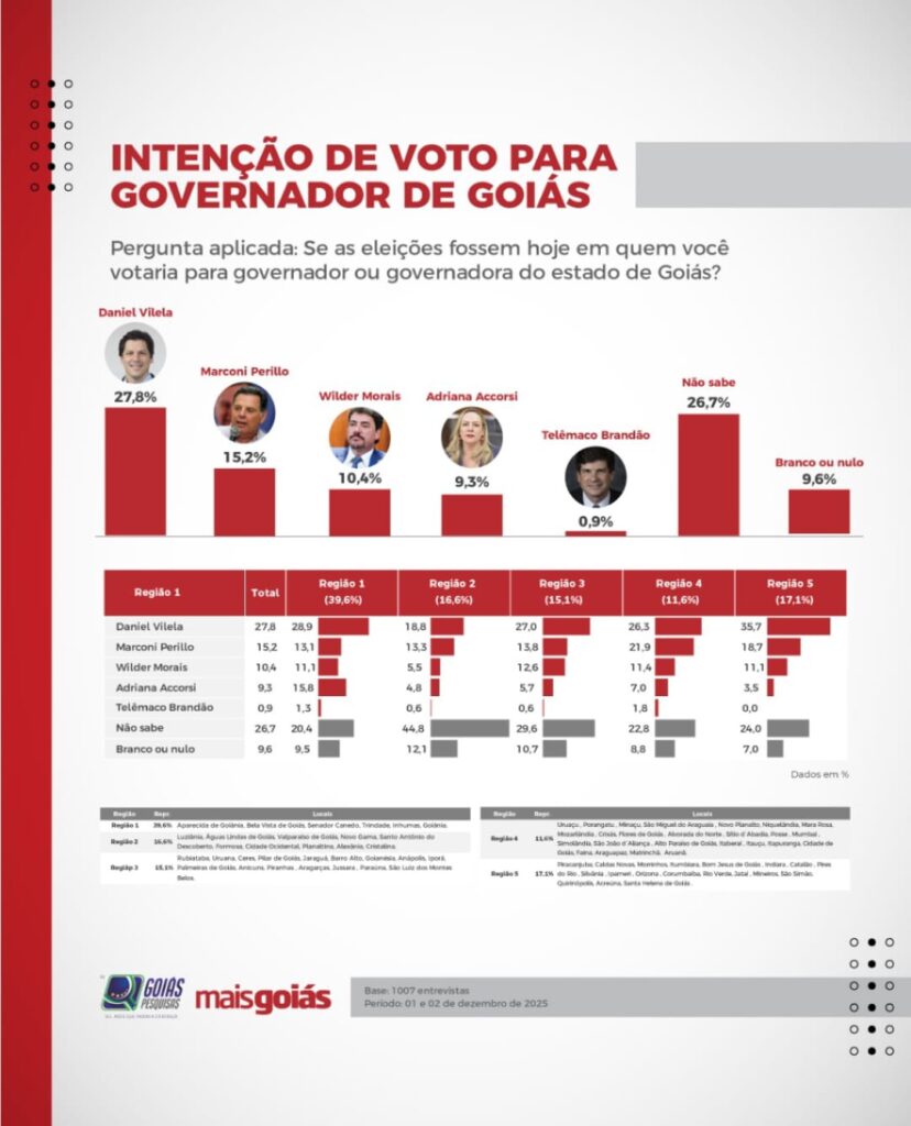 O vice-governador Daniel Vilela (MDB) lidera a disputa pelo governo de Goiás, segundo levantamento divulgado nesta quinta-feira (4/12) pela Goiás Pesquisas/Mais Goiás. A sondagem, realizada nos dias 1º e 2 de dezembro, indica que o emedebista tem 27,8% das intenções de voto. Ele assume o comando do Estado em abril de 2026, quando o governador Ronaldo Caiado (União Brasil) deixará o cargo para disputar a Presidência da República.